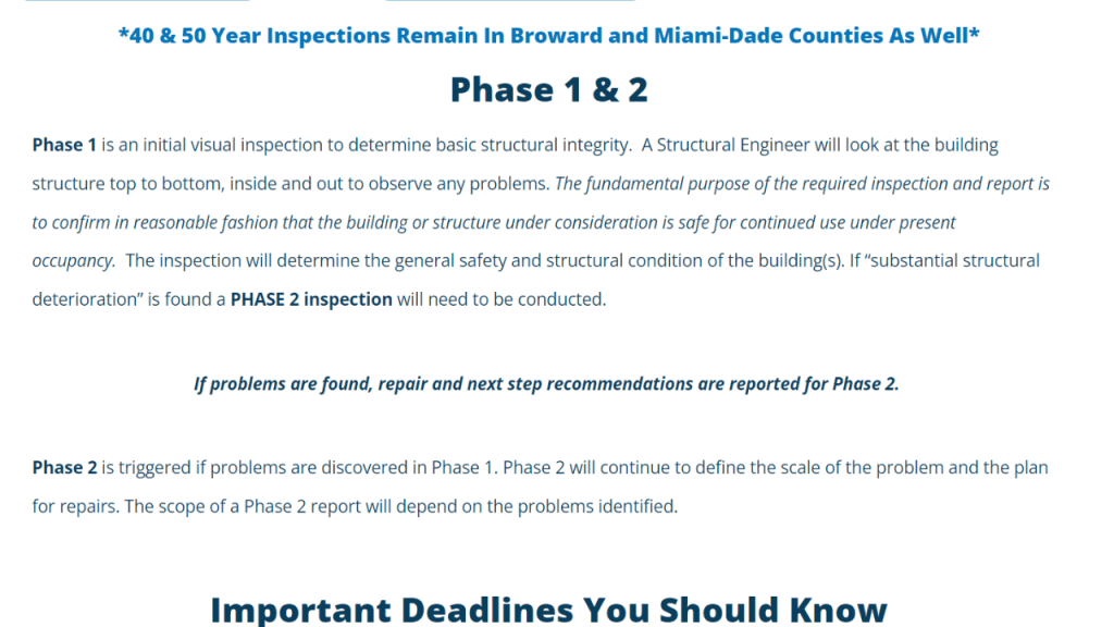 These condos will need to have a phase 1 milestone inspection/structural integrity inspection done every 10 years with the first inspection to be completed before December 31, 2024. The phase 1 study is a visual inspection of the building to see if there is substantial structural deterioration. If they identify anything in the phase 1 milestone inspection, then a phase 2 milestone inspection study must be completed.