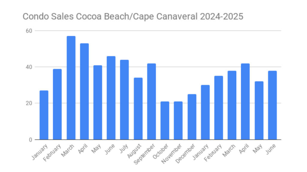 The condo market in Cocoa Beach/Cape Canaveral (really throughout the county) has taken a beating. Inventory breached the 300 level to start 2025, which is the first time I have seen it this high. Fortunately, it seemed to crest in April after hitting 359 condos for sale, and we ended the 1st half of 2025 with active condos in Cocoa Beach & Cape Canaveral.